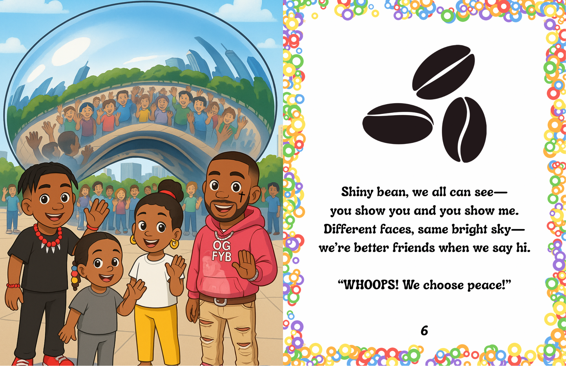 Peace you can chant. Places you can point to. A lantern’s glow in Cape Town sends Cam, Alexis, and Bianca—plus special guest FYB JMANE—on a rhyme-filled tour of Chicago’s most beloved spots. From the Harold Washington Library’s children’s room to Cloud Gate, Buckingham Fountain, the Art Institute lions, DuSable Black History Museum, Pilsen’s National Museum of Mexican Art, Garfield Park Conservatory, and Stony Island Arts Bank, the Star Fam shows how kindness, mindful breathing, and circles of belonging turn everyday city moments into “pushin’ peace.” With a catchy call-and-response refrain—“WHOOPS! We choose peace!”—this is a read-aloud built for classrooms, libraries, and families.